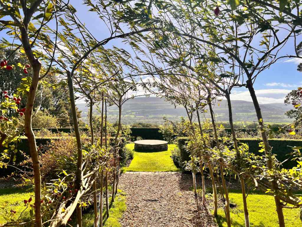 An extended coffee stop, ensconced around the open fire in the cafe helped to dry us out as we waited for the sky to clear so we could explore the garden and maze. The coffee and cake was good too!