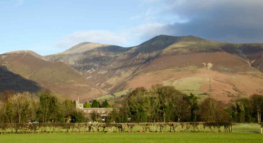Skiddaw and Little Man from the Portinscale Path. Crosthwaite Church nestles in the lee of the hills