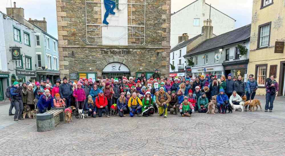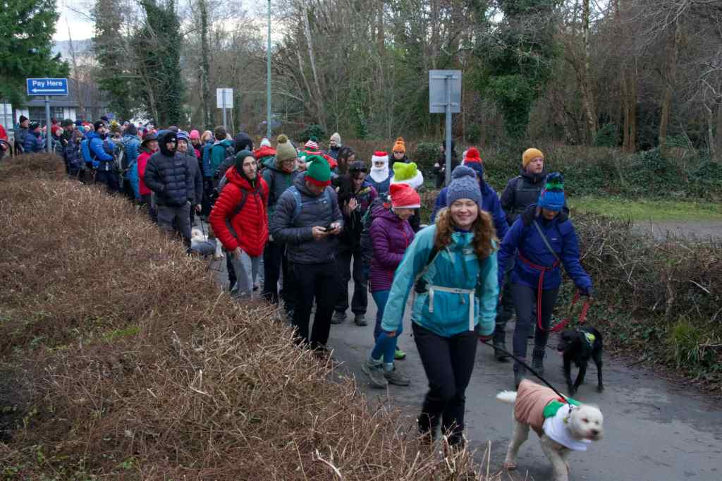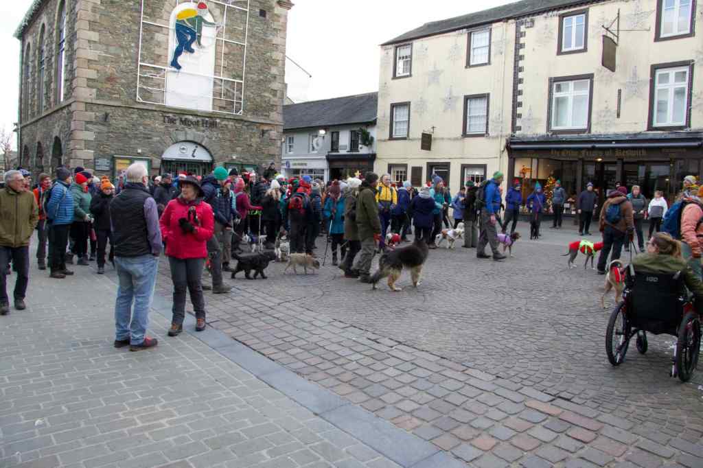 Setting off – 130 plus walkers and dogs embark on Christmas morning walk, leaving the old Keswick railway station.